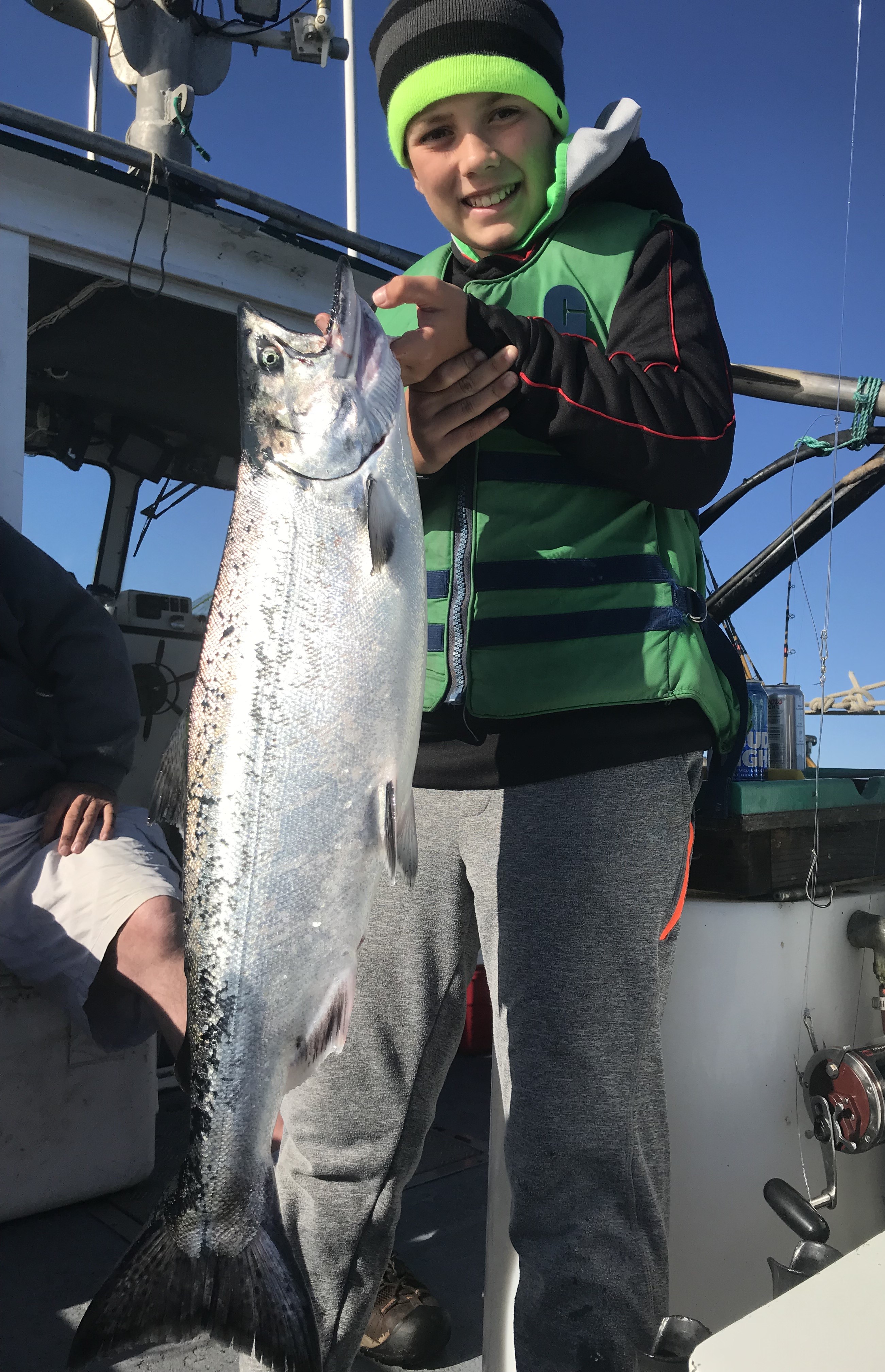 With big swells and bad tides looming out of Eureka, Skipper Tony Sepulveda of Shellback Sport Fishing, temporarily moved his operations to Trinidad. “The salmon bite was really good in Eureka, but big swells and tidal exchange made the Humboldt Bar a no go for the weekend,” said Sepulveda. “I brought Shellback to Trinidad to keep us fishing. By Monday the weather had settled and the salmon fishing got easy for everyone. Quick limits were the norm for the fleet and we had plenty of time to make the run to Reading Rock for limits of lingcod and amazing rockfish. The positive from all this wind is the water rolled over and is loaded with bait from 35 to 60 fathoms. Our fish on Tuesday were stuffed with krill, squid and sardines and the meter was lit up everywhere we went.”