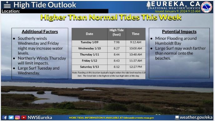 Perigean spring tides, the results of either a new or full moon, will be in effect beginning Jan. 9 through Jan 13. The highest tides are predicted for Thursday and Friday. The north spit tide gauge prediction is for a high tide of 8.44 feet at 10:48 a.m. Thursday morning and 8.43 feet at 11:37 a.m. Friday morning. Minor coastal flooding around Humboldt Bay is possible and large surf may wash farther than normal onto the beaches.