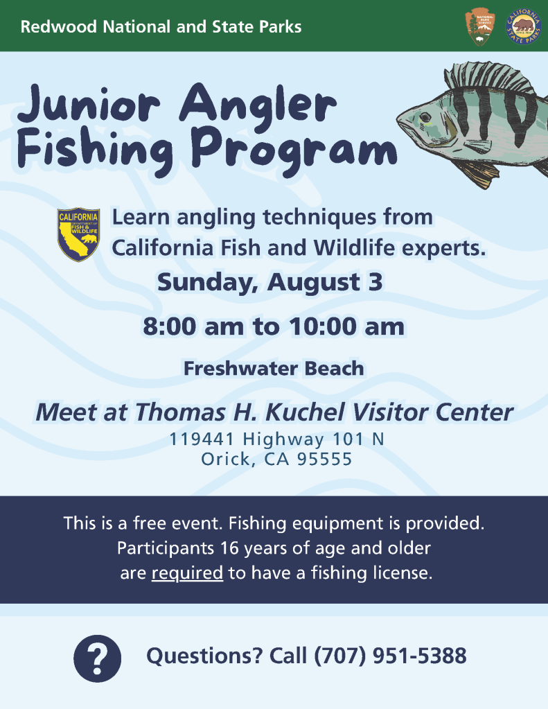 The Redwood National and State Parks, along with California Fish and Wildlife experts will be hosting a Junior Angler Fishing Program this Sunday, Aug. 3. The event, which runs from 8:00 a.m. until 10:00 a.m. will be held at Freshwater Beach with anglers meeting at the Thomas H. Kuchel Visitor Center. Address is 119441 Highway 101 N. in Orick. This is a free event and fishing equipment will be provided. Participants 16 years and older are required to have a fishing license. For more information, call 707-951-5388.