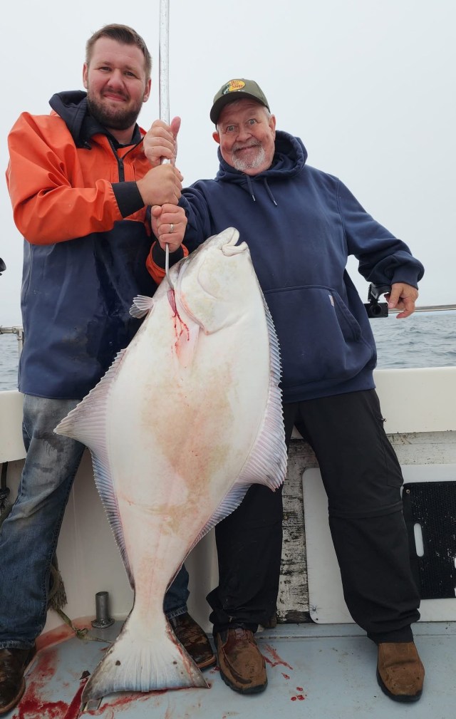 Keith Daniels, right, along with grandson Brian landed this nice Pacific halibut Wednesday while fishing out of Eureka aboard the Sea Weasel II. Photo courtesy of Gary Blasi/Full Throttle Sport Fishing