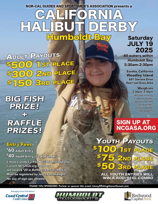 The Nor-Cal Guides and Sportsmen’s Association will be holding the first annual California Halibut Derby on Saturday, July 19. The fishing event will be held within the waters of Humboldt Bay. Check-ins, Weigh-ins and Awards Ceremony will be held at Woodley Island, 601 Startare Drive at the East-I Lot Grass Area.